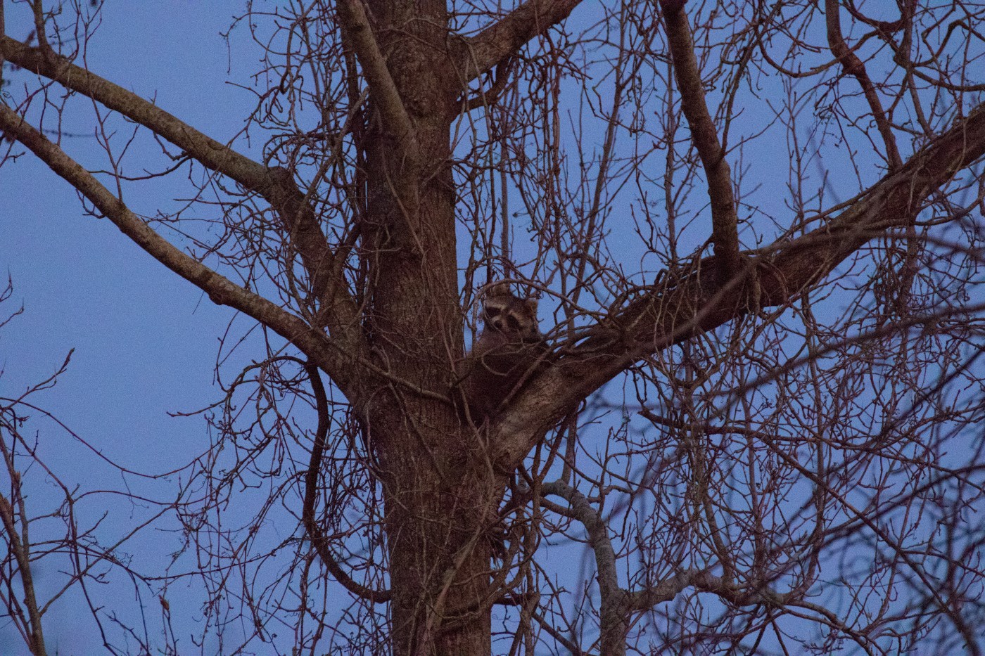 Lunch time quickly ended and I barely had enough time to throw a sandwich together before heading back to the office. Fast forward a few hours and I was headed home and wondering all the way if the Raccoon was still sleeping soundly in the tree awaiting nightfall. To my surprise he was indeed.