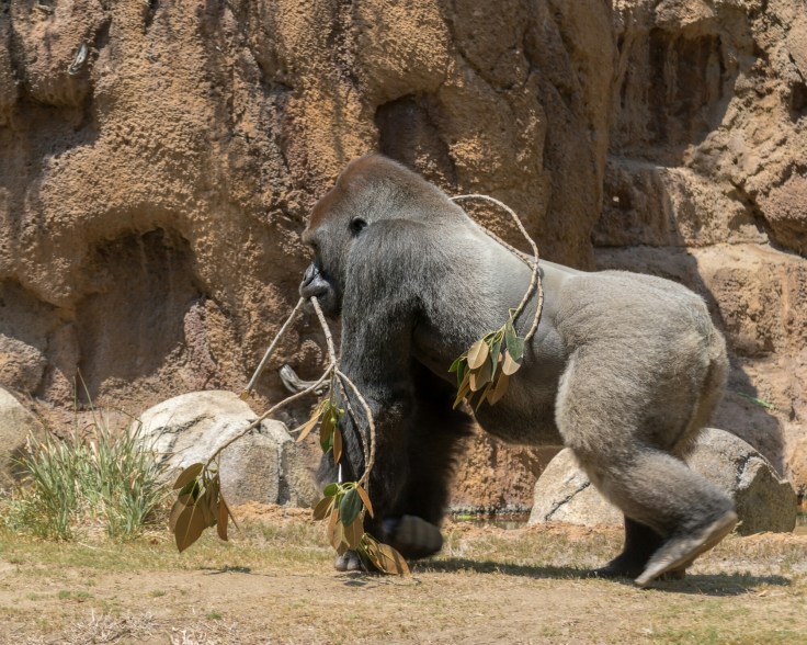 This adult male Western Lowland Gorilla decided he wanted to eat his lunch in peace. He grabbed the branch and sauntered off to where no one could watch him eat.